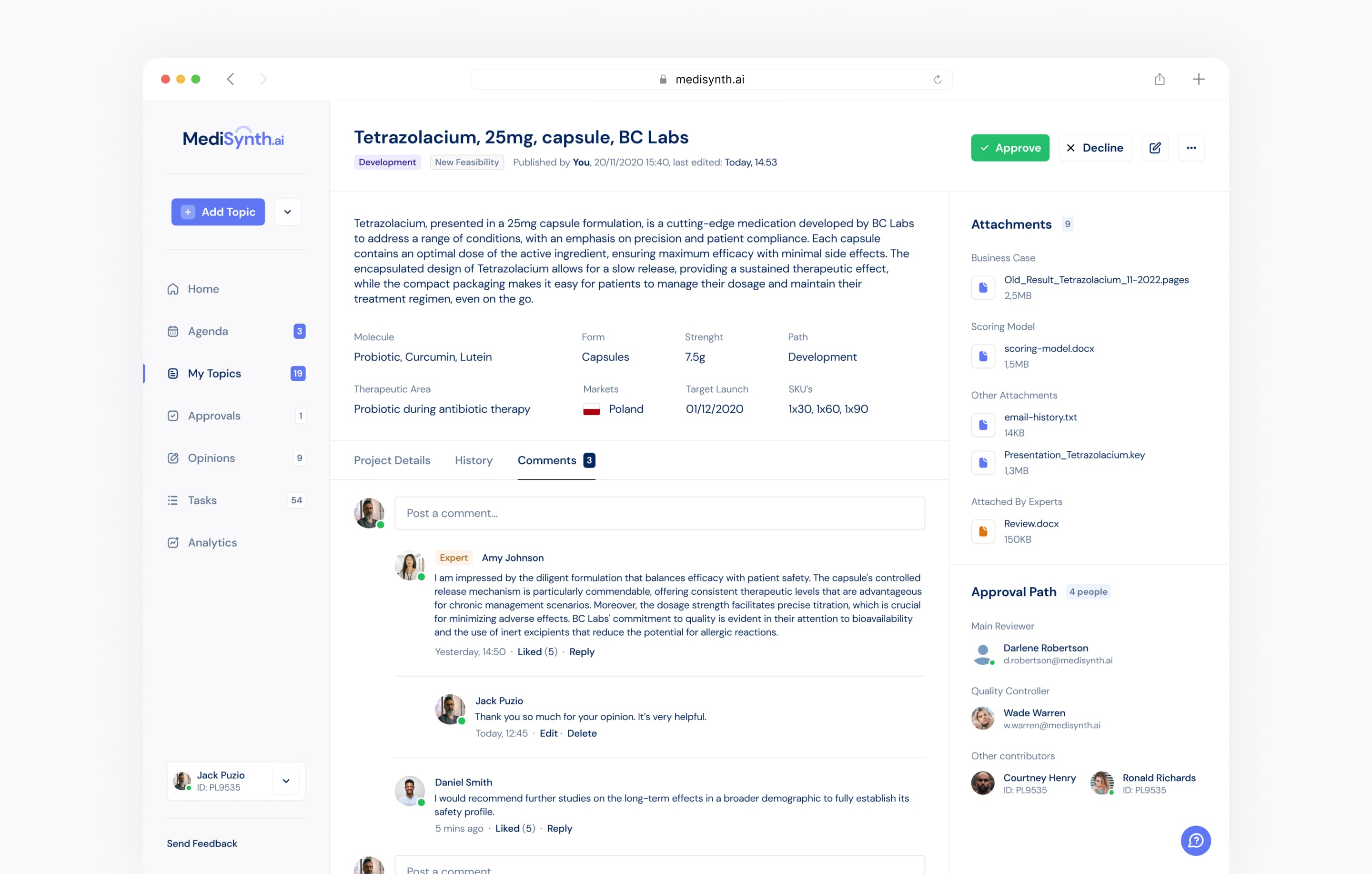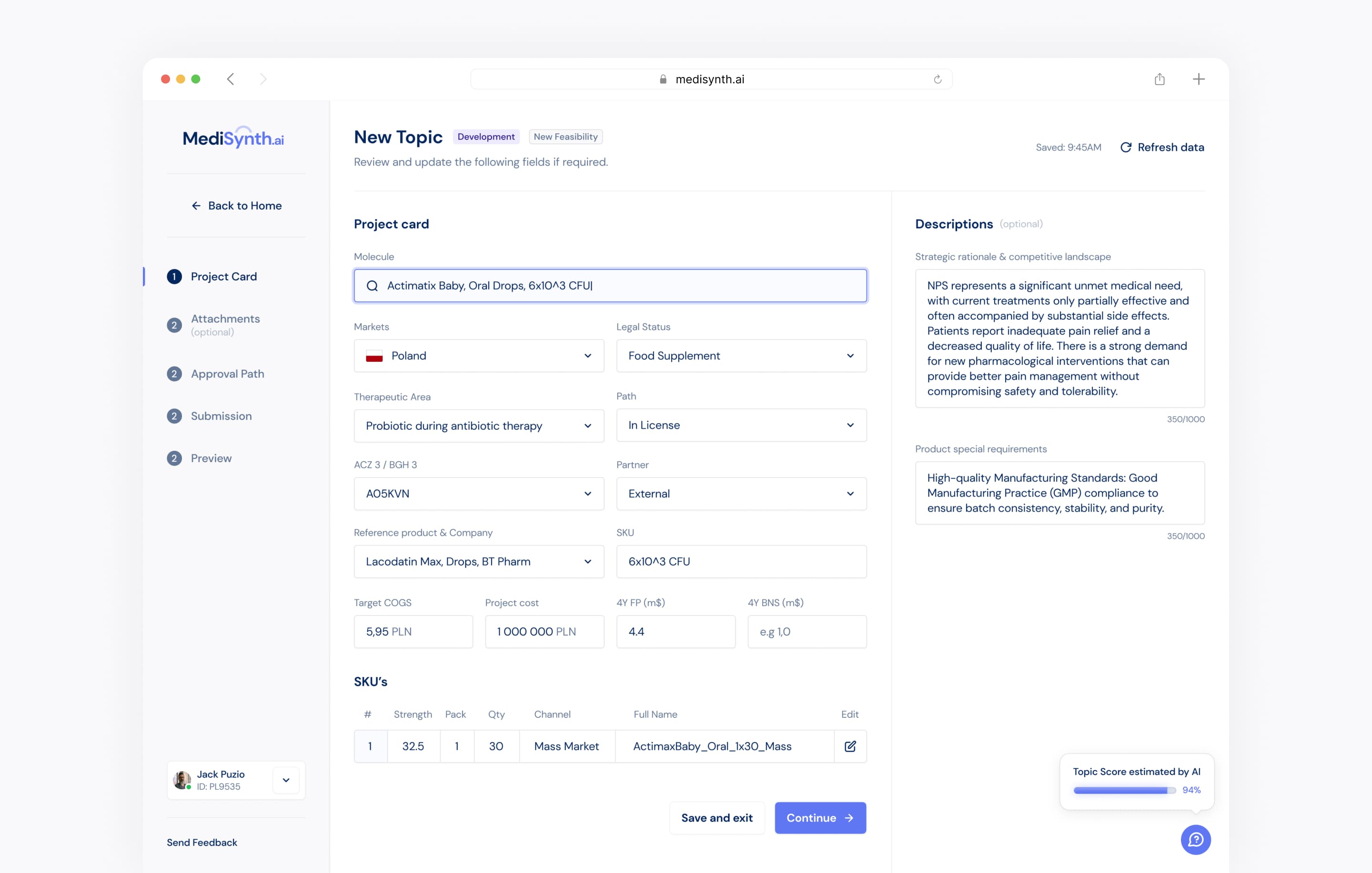 The AI-driven platform responds to the key challenges of the pharmaceutical industry by offering integrated and automated dashboard that streamline and accelerate the drug discovery and development process. Thanks to AI it enhances the initial selection of drug candidates, analyzes potential drug interactions to increase patient safety, facilitates real-time team collaboration, quickly collects and evaluates market data to adjust drug strategies and optimizes production processes. All that significantly shortening the time needed to bring new drugs to market.